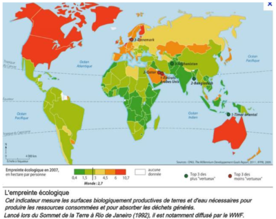 En matière d’environnement, ce sont les plus riches qui émettent le plus de G.E.S (gaz à effet de serre). Même si la carte de l’empreinte écologique n’est pas très scientifique, elle montre que les plus pauvres sont des « modèles » en terme écologique, mais est-ce là un modèle souhaitable pour le monde ?