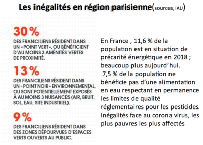 Les inégalités sont présentes aussi dans les pays développés. En Ile-de-France, par exemple, 9% des Franciliens ne disposent pas d’espace vert, 13% supportent au moins trois nuisances environnementales et la surmortalité due au COVID19 y est très notable dans les populations nées en Asie et d’Afrique.