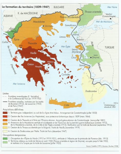 Une fois proclamée l’indépendance de la Grèce (traité de Londres en 1830, ratifié par le traité de Constantinople en 1832) dans les limites de la « Vieille Grèce » (voir carte), la Grande Idée domina toute la vie politique grecque. C’est-à-dire l’idéal de réunir à l’intérieur des frontières de l’Etat tous ceux qui se réclament de la nation grecque. Comment réunir tous les Grecs en un seul Etat-nation alors qu’ils étaient dispersés dans tout l’Empire ottoman ? Faire coïncider les frontières avec la répartition de la population au nom du « droit des peuples à disposer d’eux-mêmes » implique nettoyage ethnique et centaines de milliers de réfugiés. Michel Sivignon regrette l’absence d’un « droit d’habiter ».