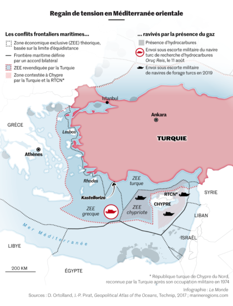 - La délimitation des frontières maritimes est un sujet épineux entre Grèce, Turquie et Chypre. La Convention des Nations Unies sur le droit de la mer (Montego Bay) distinguant eaux territoriales et ZEE ne peut pas être appliquée directement à cause de la proximité entre îles grecques et côte turque. La Turquie et la Grèce opposent leurs revendications sur les mêmes territoires maritimes depuis longtemps mais l’existence potentielle de gisements de gaz dans les eaux contestées a récemment ravivé le conflit. En outre Erdogan au pouvoir en Turquie depuis 2003 d’abord comme Premier Ministre puis comme Président de la République remet en question dans ses discours l’appartenance à la Grèce des îles proches de la côte turque, telles Lesbos, Chios, Samos ; il y a là des rodomontades dangereuses.