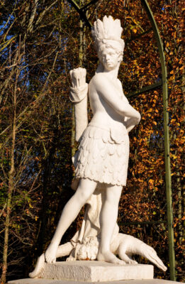 Statue d’America, allégorie du continent figurée par une femme Tupinamba vêtue de plumes et armée d’un arc, accompagnée d’un caïman et d’une tête humaine reste de cannibalisme, jardins de Versailles (© S. Rostain)