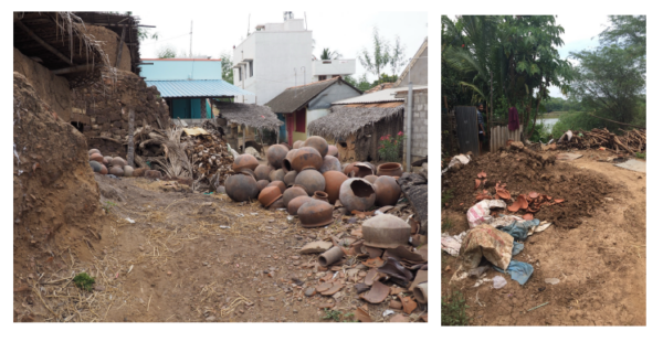 Dans les zones de front d’urbanisation de Pondichéry comme à Murugapakkam, l’activité potière décline rapidement et les espaces sont progressivement « dé-caractérisés » (Bautès). La Kusavar Street par exemple comptait une quarantaine de potiers dans les années 1980 ; ils ne sont plus que deux en 2019. Le récit d’Arumugam, potier, souligne la concurrence des produits industriels en plastique et des objets chinois importés, plus solides et moins chers. Ici, l’espace n’est plus une ressource mais une contrainte : le potier est entouré de lotissements dont les habitants supportent mal la cuisson au feu en ville, poussant les artisans à l’abandon. L’accès à la ressource n’est pas protégé par les autorités publiques, les intermédiaires marchands se multiplient sans régulation, les autorités du temple ne soutiennent pas spécifiquement la caste spécialisée des potiers.